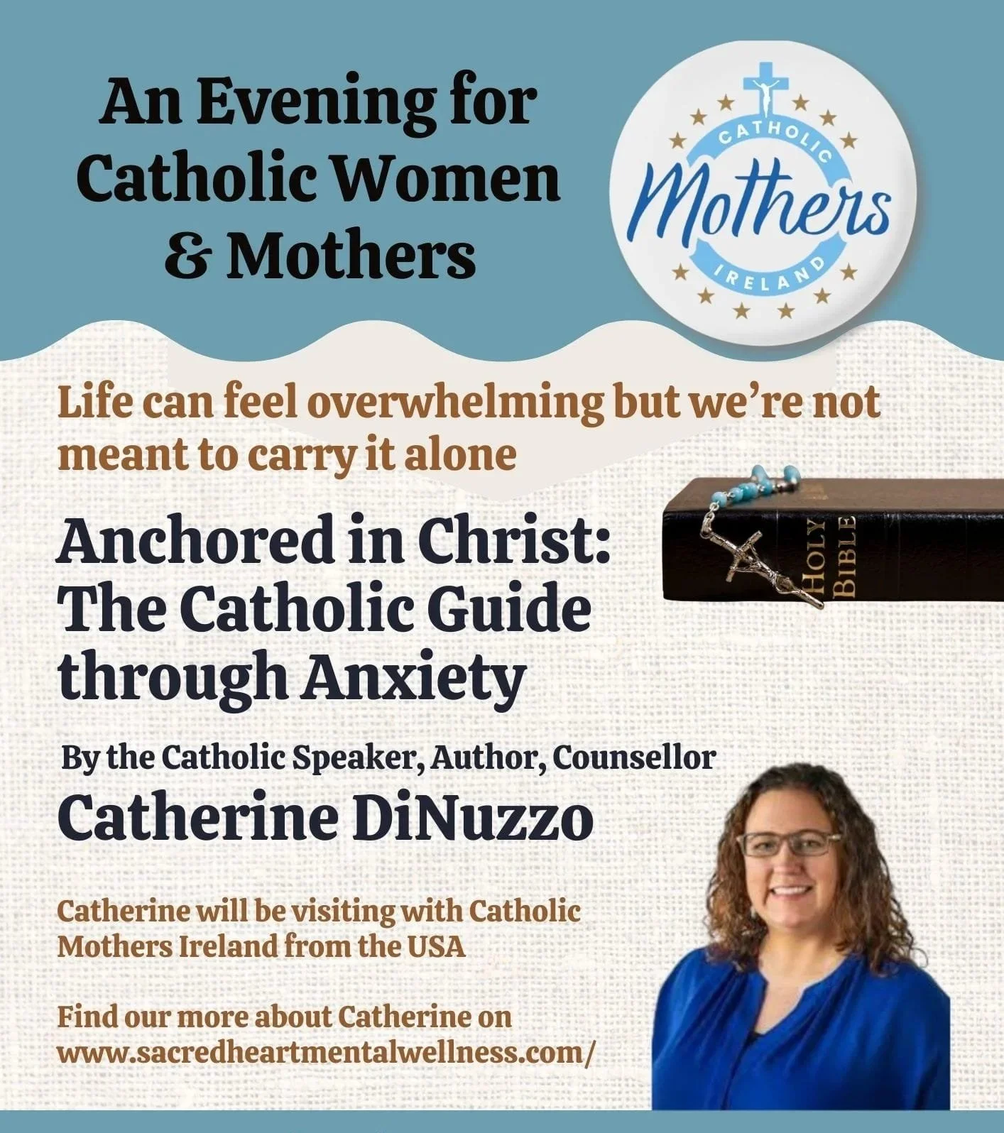 Join us for a gentle, uplifting evening with Catherine DiNuzzio, who will share practical wisdom and faith‑filled guidance on navigating anxiety with hope, strength, and the loving presence of Christ.